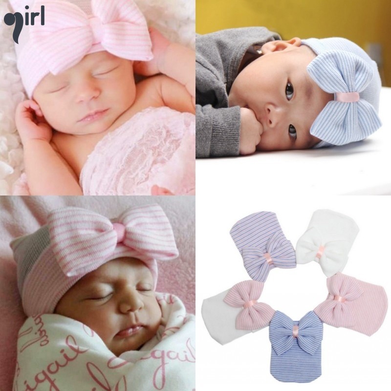 Cute Newborn Baby Girl Boys Striped Bowknot Hospital Hat Beanie