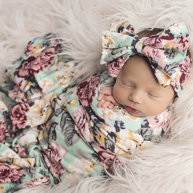 2017 Newborn Baby Floral Striped Swaddle Blanket With Headwrap