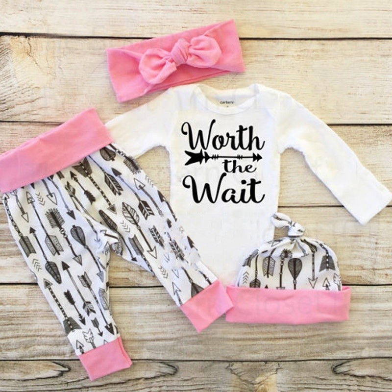 4pcs Newborn Baby Girl Outfits Set Clothes Romper Bodysuit Pants