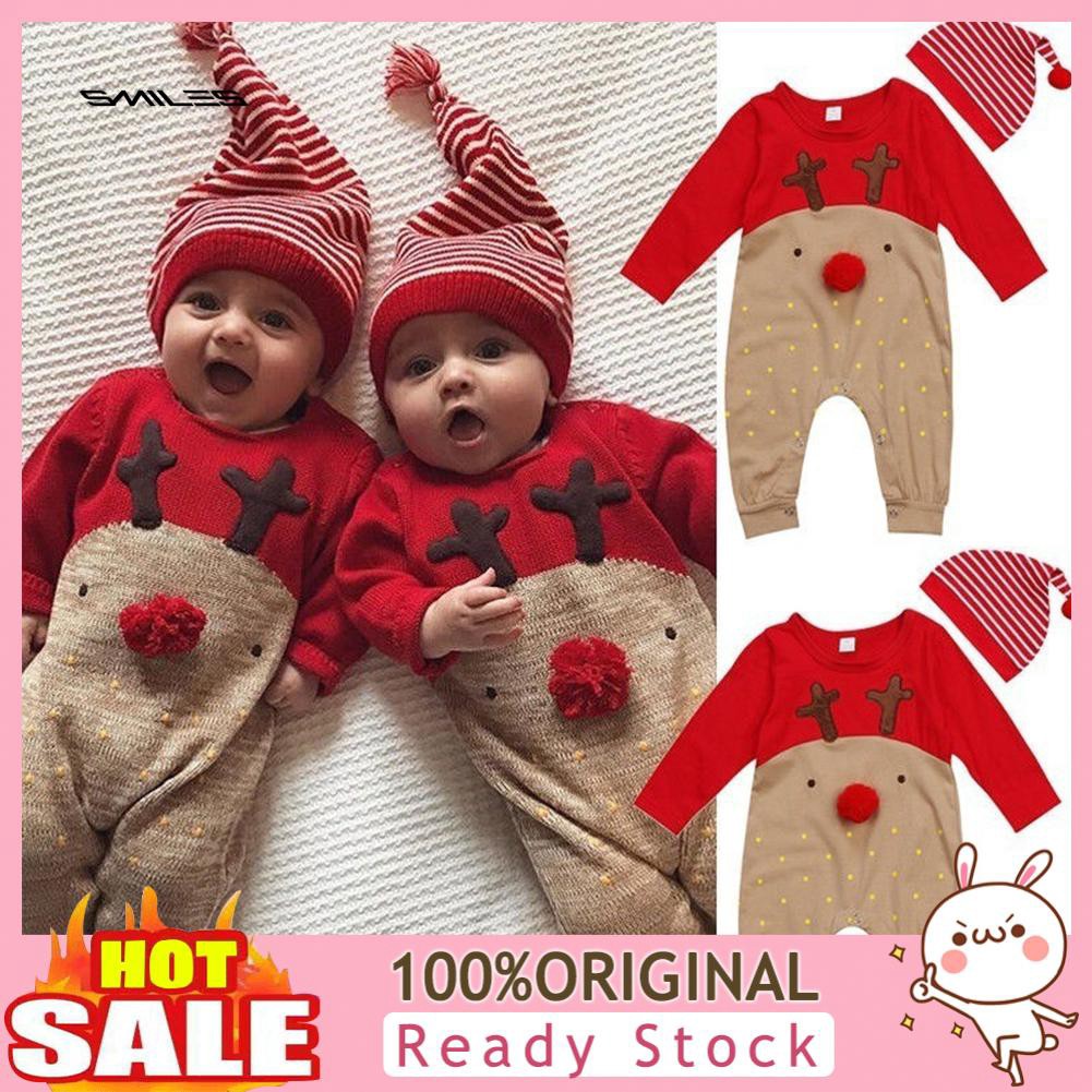Lyy Christmas Deer Print Striped Baby Boy Girl Romper Hat